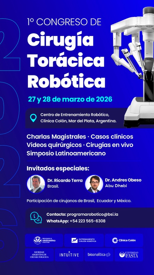 Los días 27 y 28 de marzo de 2026, en Mar del Plata, se realizará en nuestra institución el 1.º Congreso de Cirugía Torácica Robótica, organizado por el Programa de Cirugía Robótica de Clínica Colón.